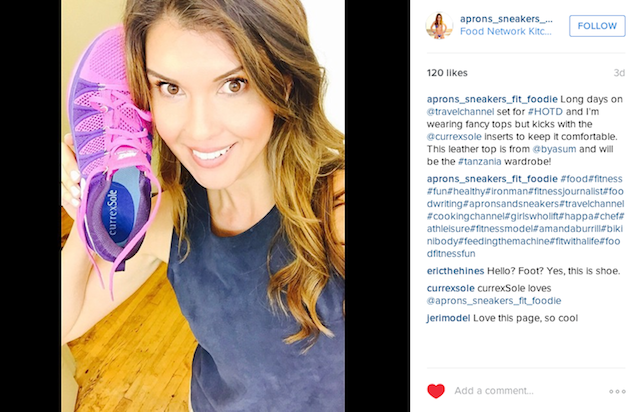 Fancy dresses and comfy kicks–“During long days on set at Travel Channel set for #HOTD I wear fancy tops but running kicks with currexSole inserts to keep it comfortable. This leather top is from Byasum and will be the Tanzania wardrobe.”