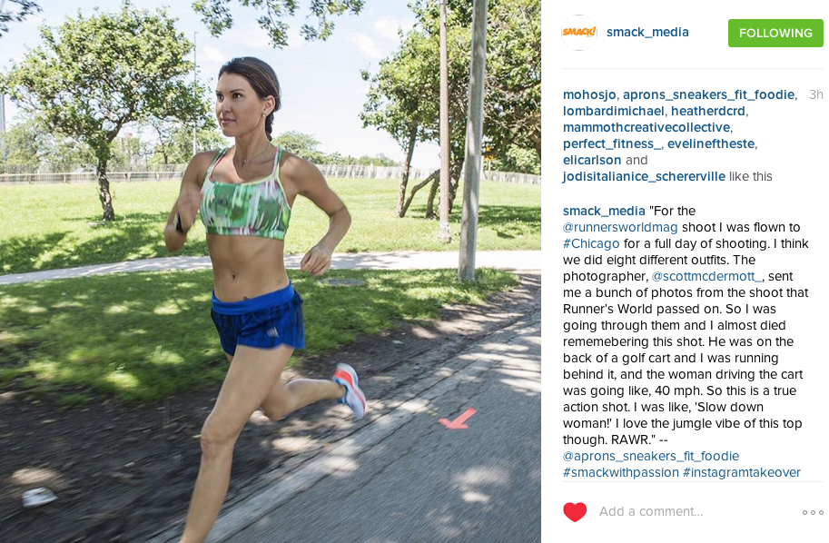 Behind the scenes–“For the Runner’s World shoot, I was flown to Chicago for a full day of shooting. I think we did eight different outfits. The photographer, Scott McDermott, sent me a bunch of photos from the shoot that Runner’s World passed on. So I was going through them and I almost died remembering this shot. He was on the back of a golf cart and I was running behind it, and the woman driving the cart was going like 40 mph. So this is a true action shot. I was like, ‘Slow down woman!’ I love the jungle vibe of this top though. RAWR.”
