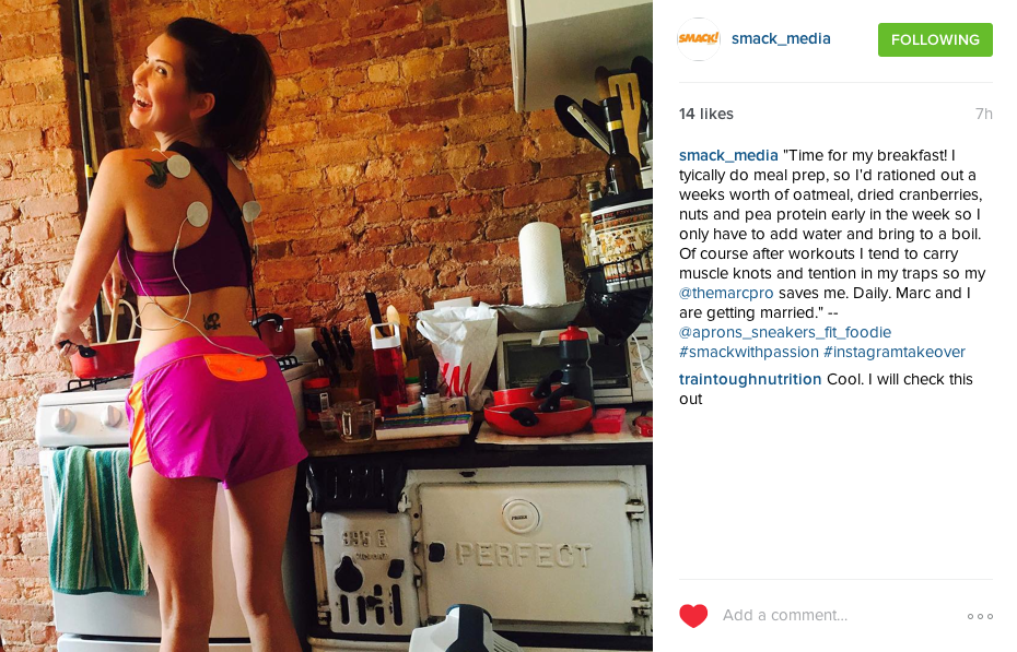 She loves MarcPro–“After workouts I tend to carry muscle knots and tension in my traps so my MarcPro saves me. Daily. Marc and I are getting married.”